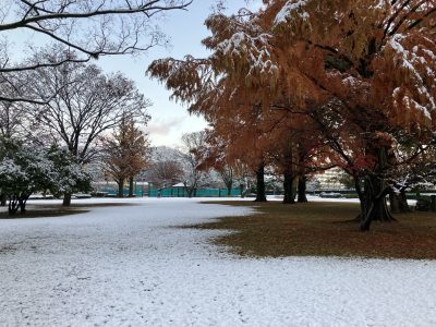 その翌日、野一色公園は何と雪化粧、黄色の地面が白くなっていました。