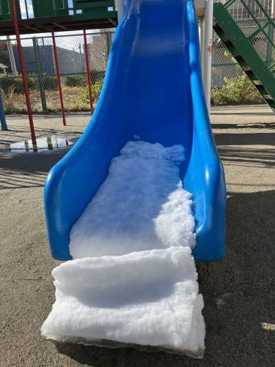 園庭の滑り台ではすべった雪が見るフィールのようになっていました。