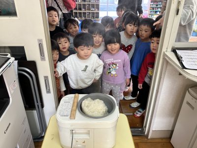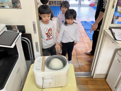 事務室では餅つき機を使ってもち米を蒸しています。匂いにつられて集まって来た子どもたちからは