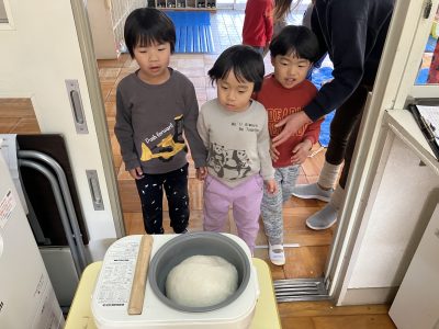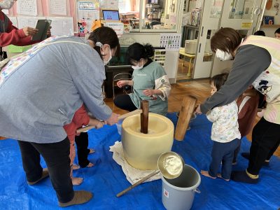 何日も前から「も~ちつき、ペッタンコ!」と保育園の中で餅つきの歌声が響き、餅つきの絵本を読み、楽しみにしてきました。