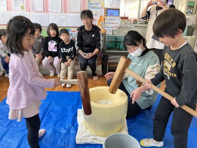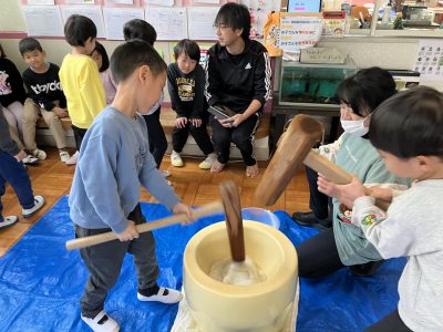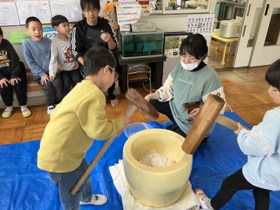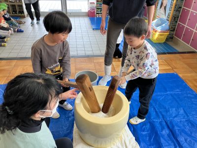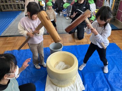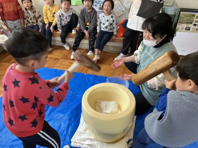 さすが年長きりん組、力強くペッタンコ!全員が少しずつお餅つきを体験しました。