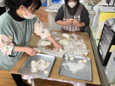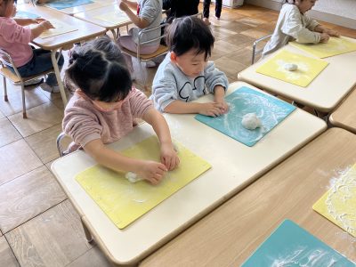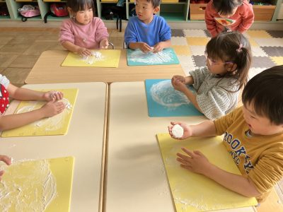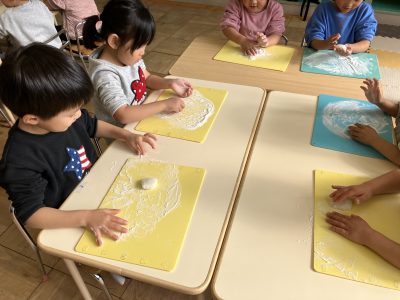 子どもたちは手にうち粉をたっぷりつけて、丸めたり、伸ばしたり、夢中です。