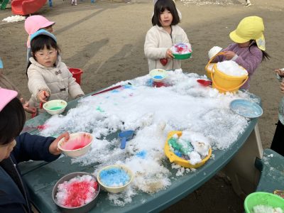 テーブルの上に残っていた雪を集めて、絵具をかけたら、もう本物そっくりのかき氷です。