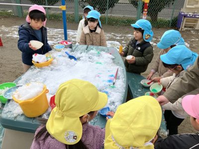 岐阜市内でもこの土日、10㎝ほどの雪が積もりました。休み明けに「お家で雪遊びをしたよ~」「雪だるま作ったよ~」