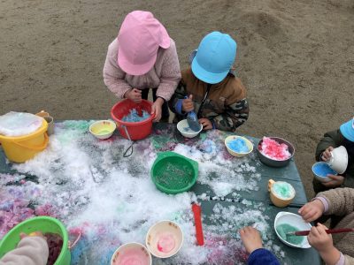 イチゴに、メロンに、レモンに、ブルーハワイ、色を混ぜたら紫のぶどう色に変身、朝一番の園庭遊びです。
