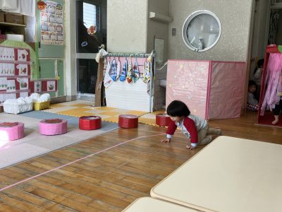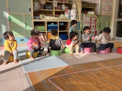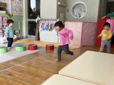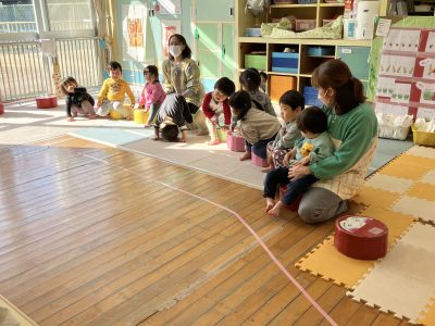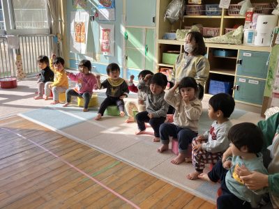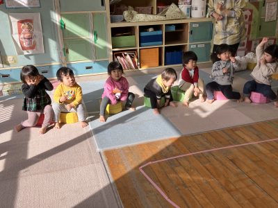 ひよこ組さんが大好きなだるまさんごっこ、イチゴにメロンにバナナさん、名前を呼ばれると元気よく登場します。