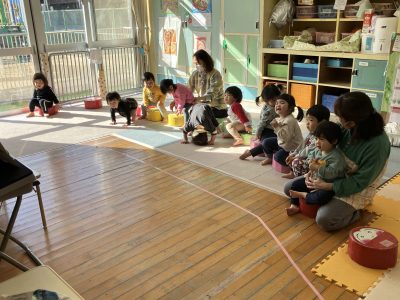 「だ~る~ま~さんが・・・」の掛け声に合わせて、一人一人が体全体を使ってだるまさんになり切ります。