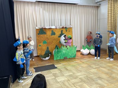 次はきりん組「きょうりゅう物語」です。年長さんらしいみんなで考えた創作劇です。