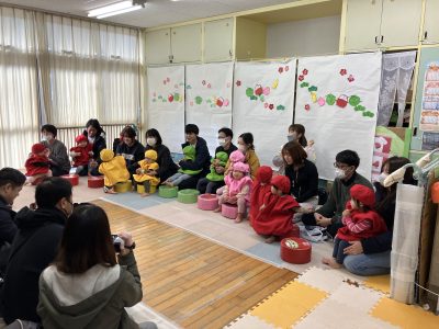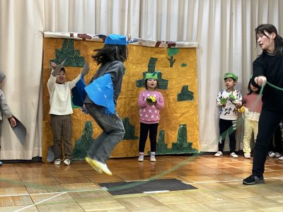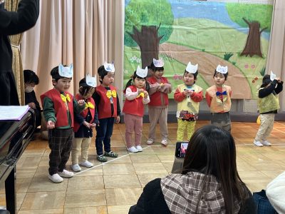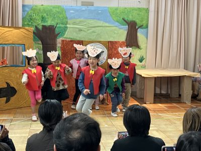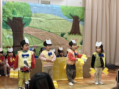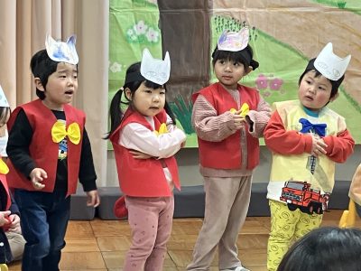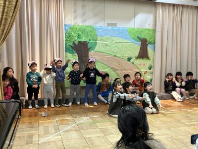 年少、うさぎ組の発表は永遠の名作「おむすびころりん」です。子ども達はこれまで、おじいさん、おばあさん、