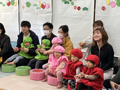 ひよこ組は保育園での初めての生活発表会です。かわいいだるまさんの衣装を身につけた子どもたちが
