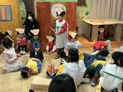 年中、ぱんだ組の劇ごっこは「オオカミと七ひきの子ヤギ」です。個性的なオオカミや子ヤギ、お母さんヤギが