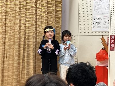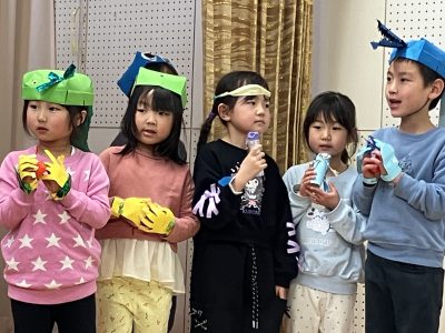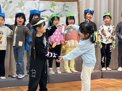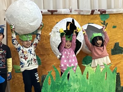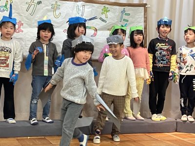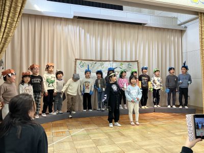 そして午後は年長、きりん組の発表です。「きょうりょうものがたり」は子どもたちがアイデアを出し合って