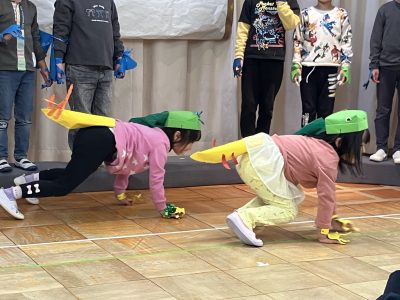 2月13日(金)、生活発表会本番、きりん組は劇ごっこの最後に迫力ある恐竜の骨格標本を組体操で表現しました。