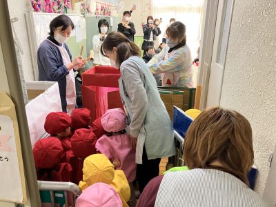 年中、ぱんだ組の劇ごっこは「オオカミと七ひきの子ヤギ」です。個性的なオオカミや子ヤギ、お母さんヤギが