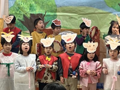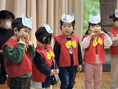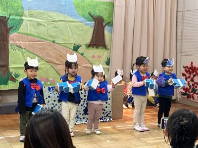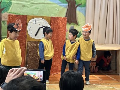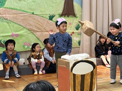 年少、うさぎ組の発表は永遠の名作「おむすびころりん」です。子ども達はこれまで、おじいさん、おばあさん、