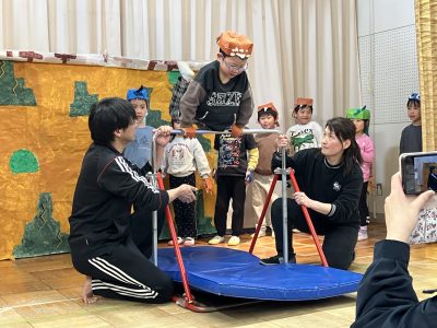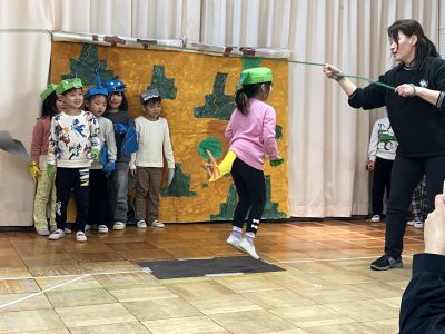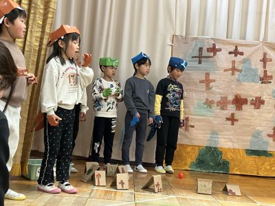 そして午後は年長、きりん組の発表です。「きょうりょうものがたり」は子どもたちがアイデアを出し合って