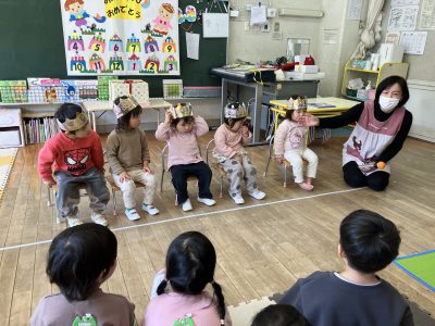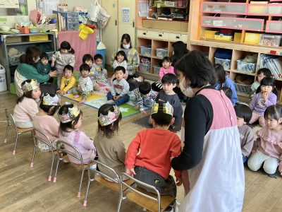 2月誕生会は、未満児クラスは5人が、以上児クラスは2人がお友だちからの祝福を受けました。