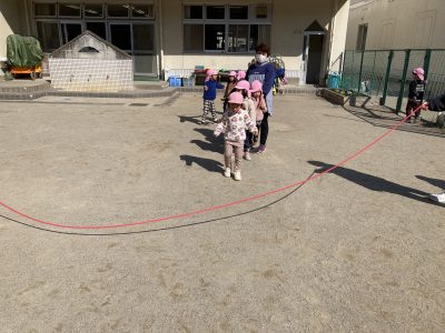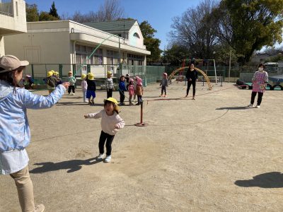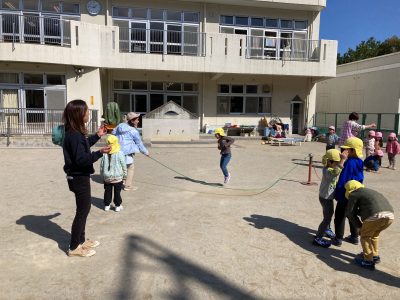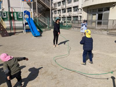 卒園記念イベントの一つ「大縄跳び遊び大会」です。縄を回しているのは、ぱんだ組ときりん組の先生たちです。