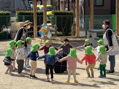 りす組は先生と一緒にみんなで丸くなって遊んでいます。先生の掛け声で一斉に逃げ出します。