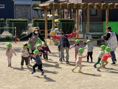 熊さんにつかまらないように「逃げろ~!」、先生と子どもたちが手をつなぐように