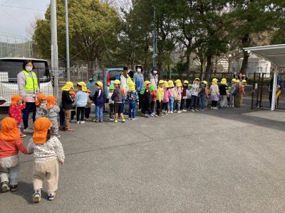 ひよこ組、りす組の子たちと優しく手をつないで、出発準備が整いました。