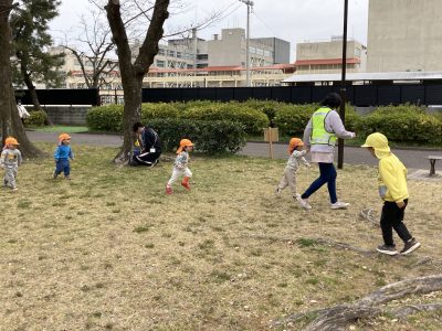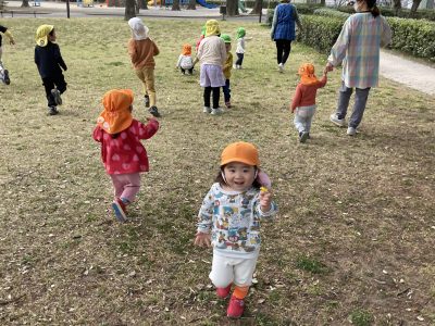 公園に着くと、広い芝生広場を早速駆け出しました。ひよこ組さんがたんぽぽの花を見つけたようです。