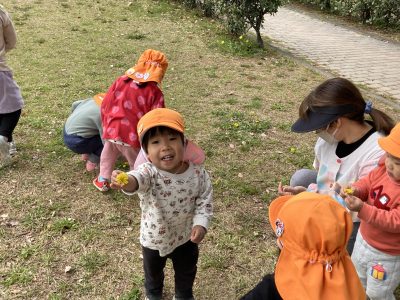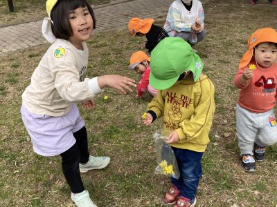 「ぼくも見つけたよ~」「わたしのも見て見て」と、たんぽぽ摘みに熱中しています。春ですね~、
