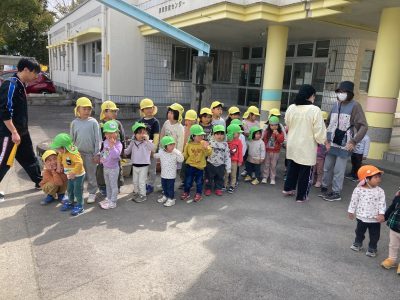 今日は、きりん組、ひよこ組、りす組合同のお別れ散歩です。玄関前では、きりん組全員が小さな