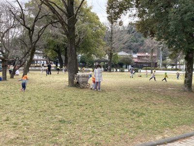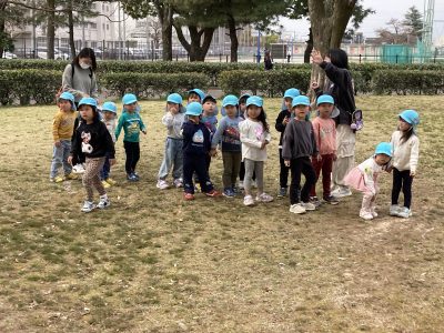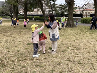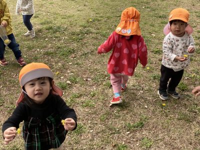 公園に着くと、広い芝生広場を早速駆け出しました。ひよこ組さんがたんぽぽの花を見つけたようです。