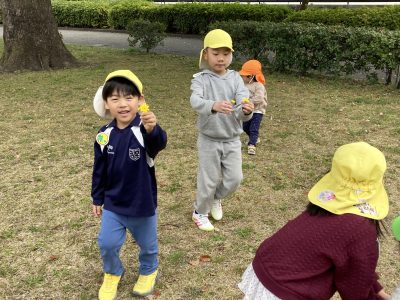 「ぼくも見つけたよ~」「わたしのも見て見て」と、たんぽぽ摘みに熱中しています。春ですね~、