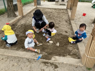 生活にも慣れ、園庭でもあっちにちょこちょこ、こっちにとことこ、特にお気に入りの場所は砂場です。