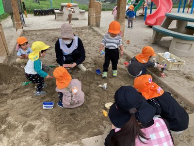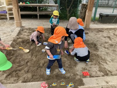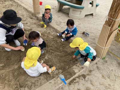 そこにやって来たのは、りす組さん、好きな砂場遊びの玩具を持ってきて、穴を掘ったり、山を作ったり、さすがは