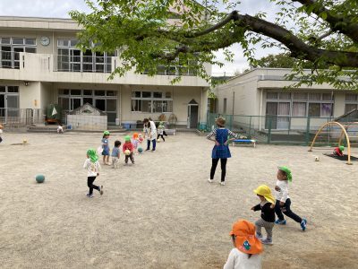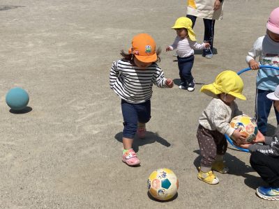 園庭の真ん中では、ぱんだ組さんとりす組さんが、鬼ごっこやボール遊びに熱中しています。