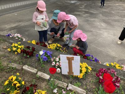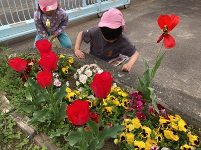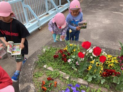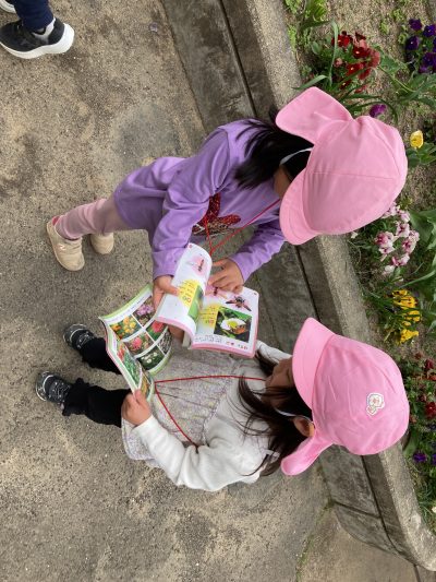 ここは玄関前の花壇、きりん組さんが図鑑を片手に何やら調べているようです。
