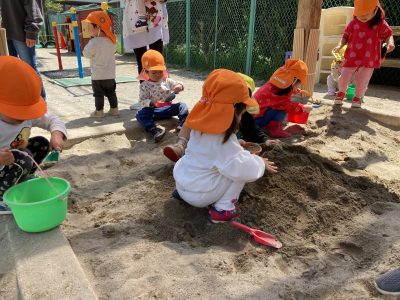 春のポカポカ陽気に誘われて、子ども達が園庭に出てきました。入園したてのひよこ組さんも、日に日に保育園での