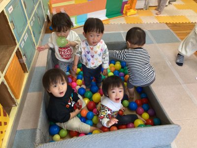 ひよこ組では、カラーボール遊びに子ども達は熱中・夢中で楽しんでいます。