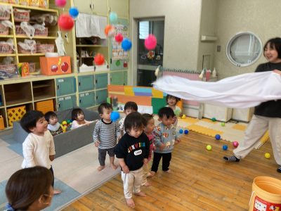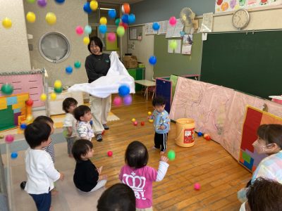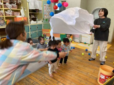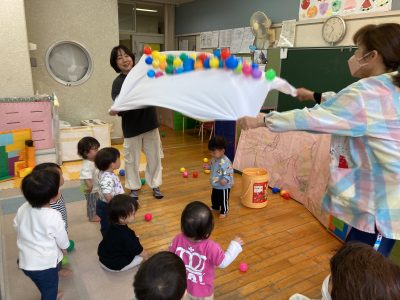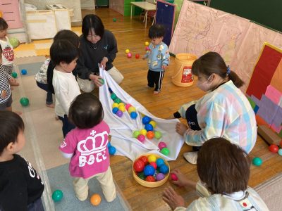 大きな布にたくさんのカラフルなボールを入れて「いっせ~の!」で布を振り上げると、