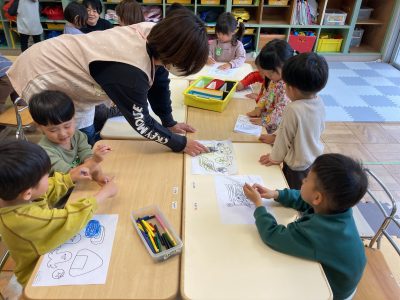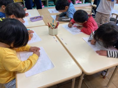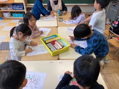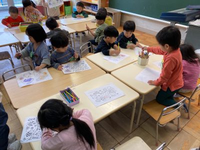うさぎ組は「塗り絵コーナー」です。いろいろな塗り絵の下絵が準備されていて、子ども達は好きな絵を選んで