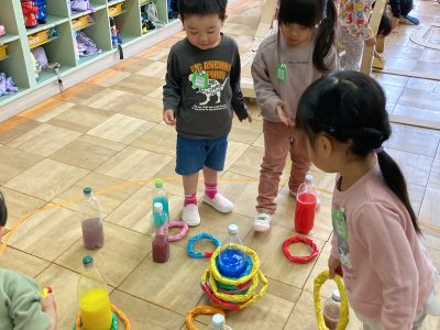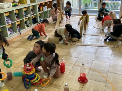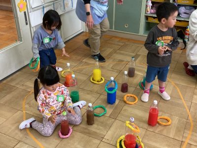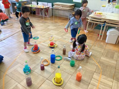 ぱんだ組は「輪投げコーナー」と「ドライブコーナー」です。色とりどり、大きさも様々なペットボトルや輪を選んで