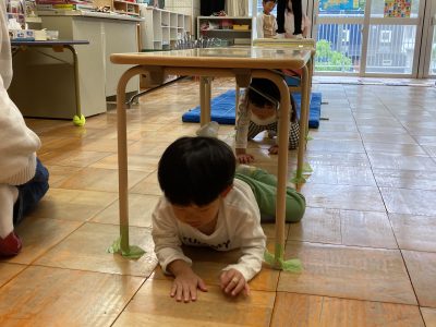 机のトンネルをくぐれば、ゴールです。きりん組には、年長さん用のチャレンジコースが作られ、