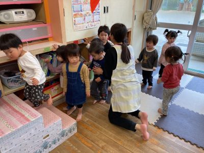 以上児クラスは春の遠足雨バージョンのはじまりの会です。みんなで集まってお約束を確かめ合って、