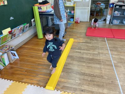 一本橋渡りに、階段の上り下り、そしてゴロゴロマットを楽しんでいます。