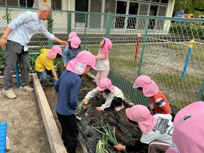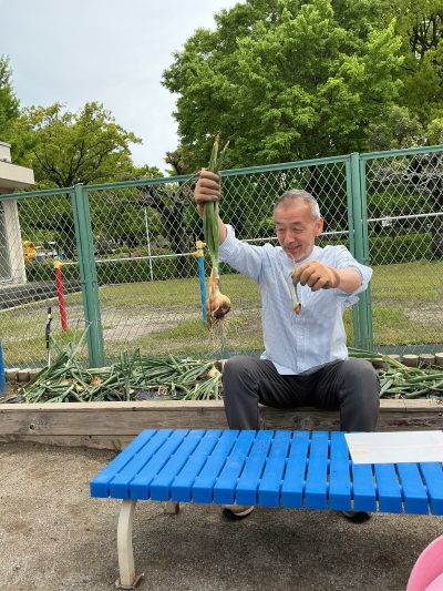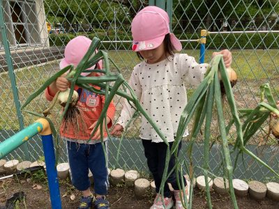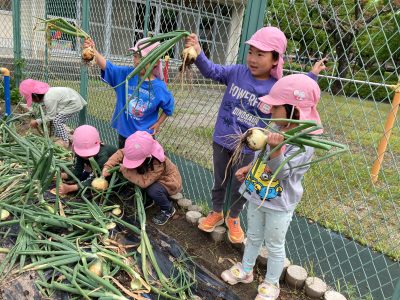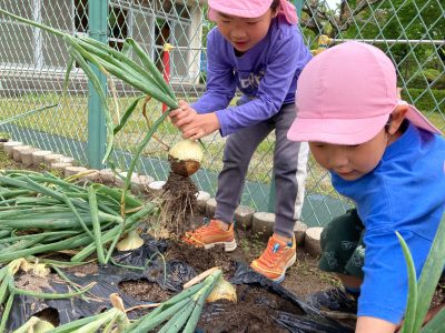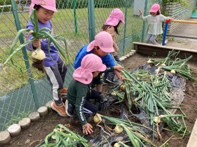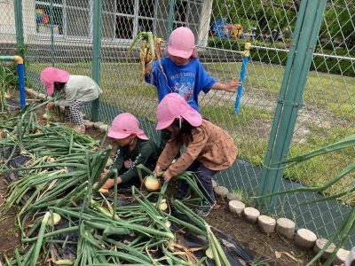 今日はお天気もよく、絶好の収穫日和です。保育園のたまねぎ畑が収穫の時期を迎えました。