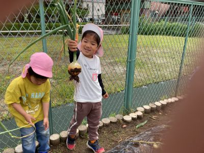 順番に畑に入り、早速、収穫です。よいしょと力を入れて引っ張ると、「メリメリメリッ!、スポン!」と抜けました。