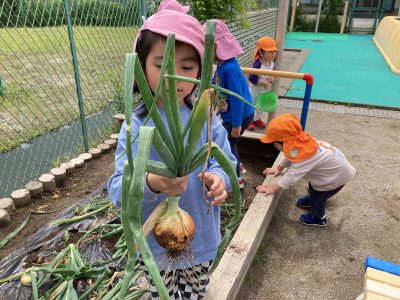 大きな玉ねぎをねらって「うんとこしょ! どっこいしょ!」、「採ったぞ~!」