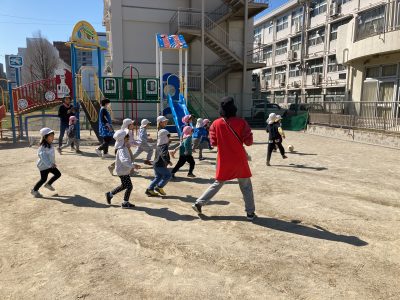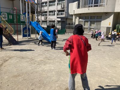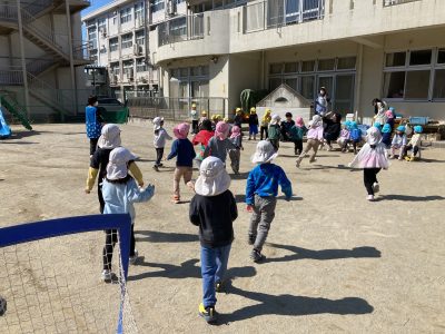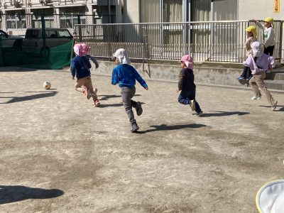 フィールドは園庭全体、子どもたちも先生たちもボールを追いかけてあっちへ行ったり、こっちへ行ったり、