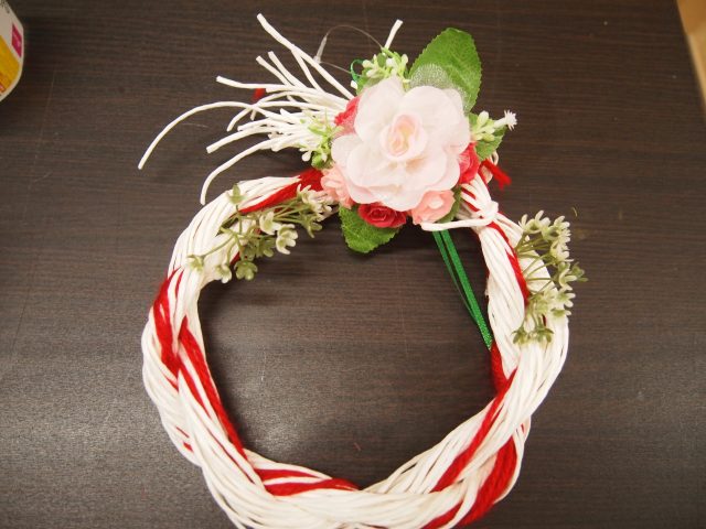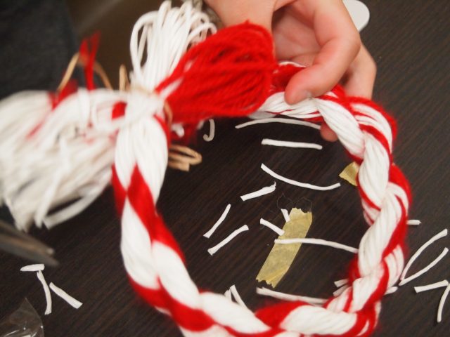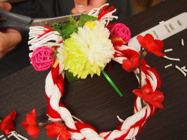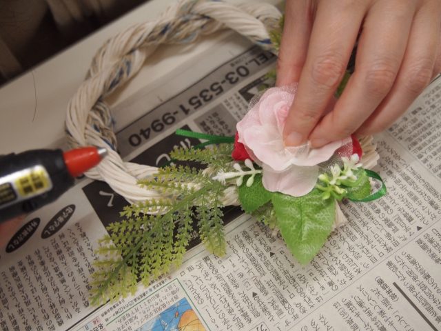 しめ縄を編んだ後は、グルーガンを使って、飾りつけをしたら完成です。