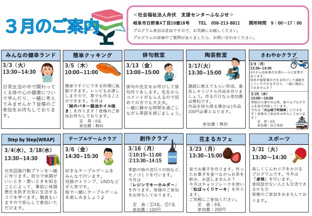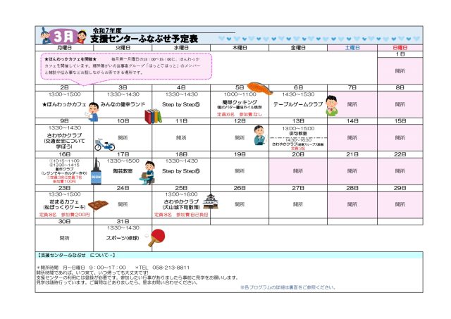 支援センターふなぶせ3月の予定表ができましたのでお知らせします。