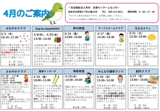 支援センターふなぶせ4月の予定表ができましたのでお知らせします。
